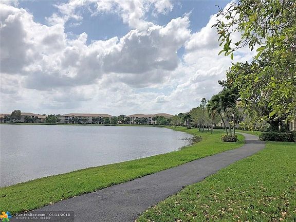 Outstanding view of the 16 acres lake from the living room, the balcony and both bedrooms. Vaulted ceiling and corner lot unit with wood like flooring throughout, in Evergreen Lakes gated resort lifestyle community. All amenities, beautiful clubhouse, picnic area, gym...Close to the Promenade shopping, Sawgrass expressway and Turnpike. Freshly painted apartment with 2 split bedrooms, full size washer dryer inside, and storage room. Owner pays water, sewer and HOA