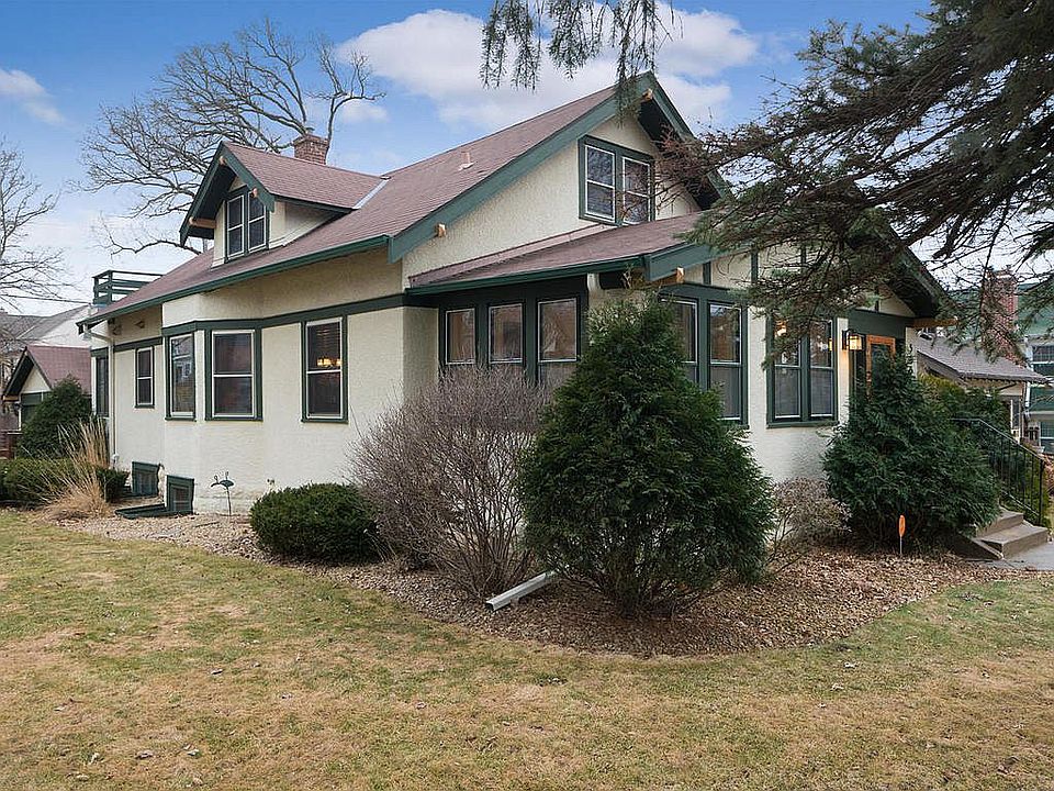 This classic bungalow has a unique large 60 ft wide south-facing corner lot with two majestic pine trees and privacy hedges. The two car garage and large driveway make it possible to get 5 cars off-street. The custom built octagon-shaped cedar deck is built for entertaining and family get-togethers. The patio and deck can accommodate an 8' hot tub in a private setting. The interior has been updated and renovated with a craftsman old world charm complete with soapstone counters, custom birch wood cabinets, custom cut soapstone sink carved from a solid block, Capital gas range, natural oak woodwork, leaded glass, built-in buffet and hardwood floors throughout. The 2nd floor is a complete Master Suite with plenty of built-in closet space, two sitting/dressing areas (in dormers) and a large bedroom. The tiled master bath has a glass-block shower with bench. The 1st floor has two bedrooms, and one newly renovated bath with soapstone counters, raised cast iron Kohler sink, custom faucets, and subway tiled tub/shower. This tub is one-of-a-kind as it is very LARGE The basement is an open environment with two sets of egress windows, french doors and glass block walls allowing natural light to fill the space. Maple French doors set off the 4th large bedroom/office. This is a one-of-a-kind house, lot, and location!
