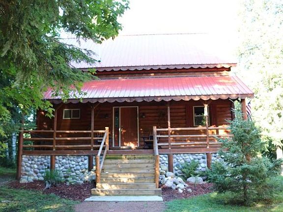 Super adorable lake house undeniably bursting with Northwood's charm inside and out! This beauty is privately situated on a dead-end road and features 130' of frontage on Mercer Lake, perfect for swimming, fishing and recreation. Appealing design exterior offers log siding, stone accents, full length covered porches- both front and back and attractive red metal roof. Enter the open concept kitchen, dining and living area with center cathedral ceiling, log siding, beautiful lakeside windows and stunning kitchen with cherry cabinets and SS appliances. Second floor master suite features peek thru window shutter to control the privacy or opens to below and the cozy family room presenting a corner stone fireplace. Finished walk out lower level leads to spacious firepit/play area, walkway to lake and large insulated/finished detached garage. Nice landscaping, city sewer, city water, natural gas, plus includes most furniture, all appliances and pier!