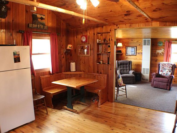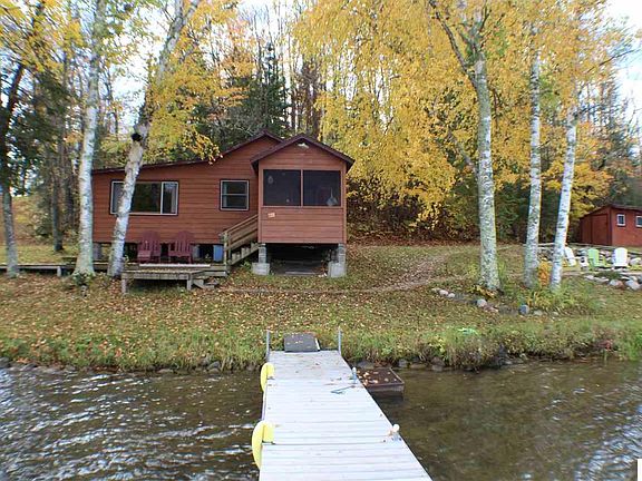 Charming cabin on the edge of the water on beautiful Turtle Lake. This 2 BR/1 BA cabin has been updated with new wiring, windows, siding and cabinets. The eat-in kitchen is well equipped for cooking your fish dinner and the living room overlooks the clear water. There are two docks to bring your boat, canoe, and more. Enjoy the lake from the enclosed porch or sit by the fire pit. This property also includes a 8 x 10 tool shed and another 6 x 8 shed. Year built is approximate. Don't miss the awesome building site on top of the hill!