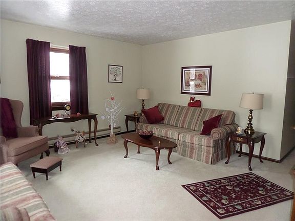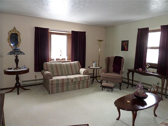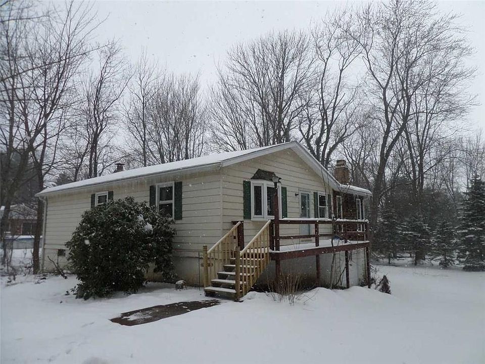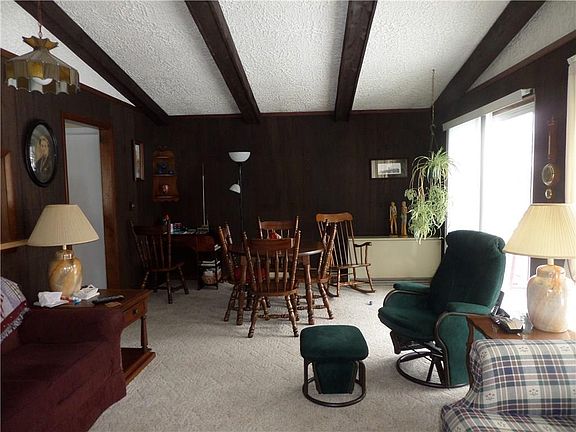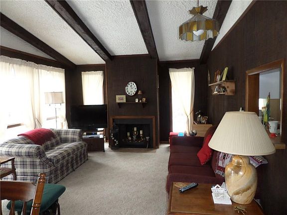 First floor family room with vaulted beamed ceiling, woodburning fireplace, glass doors lead out to a deck overlooking a treed lot with a small stream. Surrounded by nature on a low traffic street in Harborcreek.