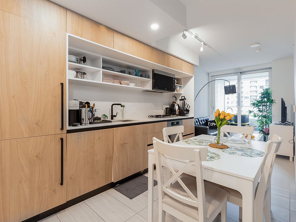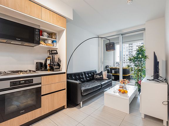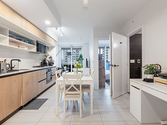JOYCE by WESTBANK. The perfect balance between convenience and luxury! This functional floorplan features an efficient kitchen with top of the line Miele appliances, custom cabinetry and sleek countertops, flowing on beautiful tiled flooring into the open concept dining and living room. Appreciate air-conditioning, triple glazed windows for superior sound insulation, 2 spacious covered balconies, roller blinds and thoughtful design touches throughout. The bathroom features floor to ceiling tiling, soaker tub with glass enclosure and designer plumbing fixtures. Building amenities include concierge, fitness centre and expansive rooftop resident's lounge. All of this in one of the most convenient locations just steps to the skytrain! ***OPEN HOUSE SATURDAY MARCH 18, 2-4PM***