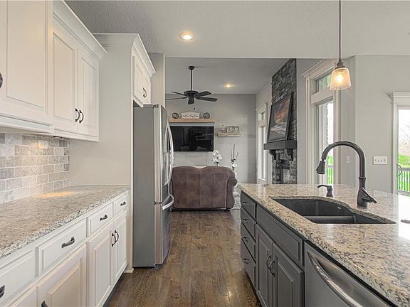 Welcome to the Move-In Ready Reverse 1.5 built by IHB Homes! The Newberry Plan with many upgrades , With All New Paint On the Outside and a Beautiful Freshly Painted Kitchen Inside!! This 4 Bedroom 3 Bath home Boasts Tall ceilings, and large windows to allow for plenty of natural light with gorgeous wood floors thru the main level. The open concept floor plan has A stunning stone fireplace , and a kitchen with custom cabinets, an oversized kitchen island and pantry. With the private master on the main with eye-catching wood beams , oversized walk-in master closet and a spa-like master bath and laundry off the extra large 3 car garage this home allows for all one level living. The covered back deck with fireplace you can access from the master and kitchen(freshly painted ). Down to the lower level, full finished basement with the Third and fourth bedrooms, full wet bar area, Very large Rec room ,additional storage area with John deer doors for additional backyard access , storm shelter/storage room. This basement has space! Walk-out to a very large patio to a beautifully landscaped fenced in back yard. This home has been freshly painted thru out the home and very well cared for !Located in Montebella Subdivision and The Park Hill School District. Your next home is ready for you!