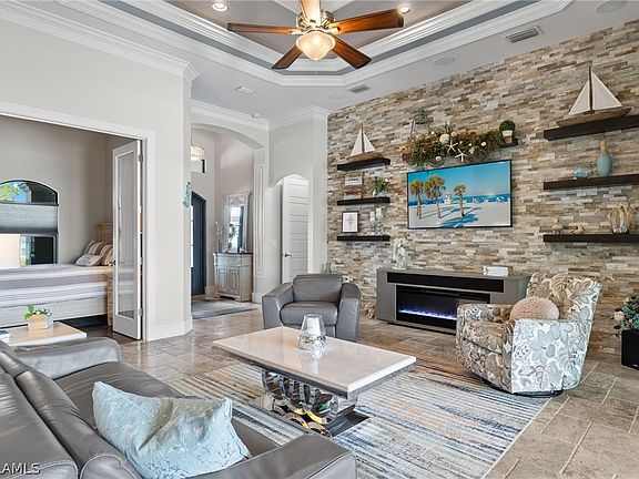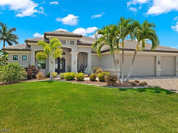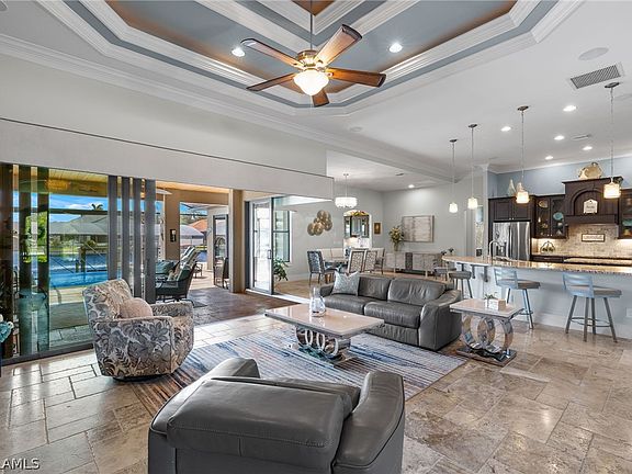 Wow! Must See! *Welcome to your Waterfront Paradise* This stunning, exotic, high-end, custom-built masterpiece embodies elegance and contemporary charm thru out & is located in the prestigious Bimini Basin area of Cape Coral. Prepare to be mesmerized by breathtaking Western sunsets and unparalleled waterfront views from this meticulously maintained property located on 200 feet of intersecting canals. Boaters, pack up a cooler & lower your boat with ease from the 40k lb covered lift complete w/ composite captain's walk-round dock, tiki bar & enjoy DIRECT RIVER TO GULF ACCESS w/ NO BRIDGES just minutes away! This fabulous, furnished, waterfront property offers the ultimate in boating convenience for a day of sightseeing, fishing, island hopping or off for a fabulous beach day to enjoy food & drink at sunny Ft. Myers Beach, Captiva or Cabbage Key. Step into your outdoor oasis within the newly installed 2024 "clear view" screened lanai, featuring a large, heated, salt-water INFINITY pool with an Aqua link system, sun-drenched shelf for luxurious tanning, tranquil in-ground jacuzzi spa & custom outdoor kitchen w/ high bar complete with a full-size refrigerator, gas grill, high-capacity ice maker, captivating fire feature, TV & outdoor shower area. The grandeur continues as you enter this fabulous property through the ornate, metal double entry doors into the expansive great room, showcasing a striking stone accent wall w/ floating wood shelves & complemented by a wall of 90-degree "disappearing" glass sliders offering panoramic water views. Entertaining is a delight in this fabulous, open, split 4 bedroom floor plan complete with an expansive, separate, water-view living space, formal dining area & wine / liquor foyer w/ wet bar. Indulge your culinary passions in the chef's gourmet kitchen, featuring large, custom real wood cabinets, high-end stainless steel appliances, island prep station, granite countertops, breakfast low bar, & large pantry. Every detail has been carefully considered, from the gorgeous primary bedroom w/ en-suite bath & pool access to the designer coffered tray ceilings to the custom crown molding to the exquisite light fixtures and to the exotic tile floors. Additional property upgrades include: 2023 tile roof ~ 2022 AC system ~ custom window treatments ~ electric hurricane sun screens ~ water treatment system ~ Wifi controlled security system ~ spacious laundry room with large cabinets & wash tub + much, much more. Situated in a safe, serene, peaceful cul-de-sac, the property also boasts an impressive stone paved driveway w/ deep, spacious three-car garage + ample space for extra storage & work area. This "move-in ready" waterfront estate home offers the perfect blend of luxury, comfort & is conveniently located near fabulous restaurants, shopping, services, etc. ***Investors - Perfect for High-end AirBnb rental property $$$ ~ Checkout both Matterport 3D virtual & Aerial drone video tours~