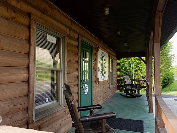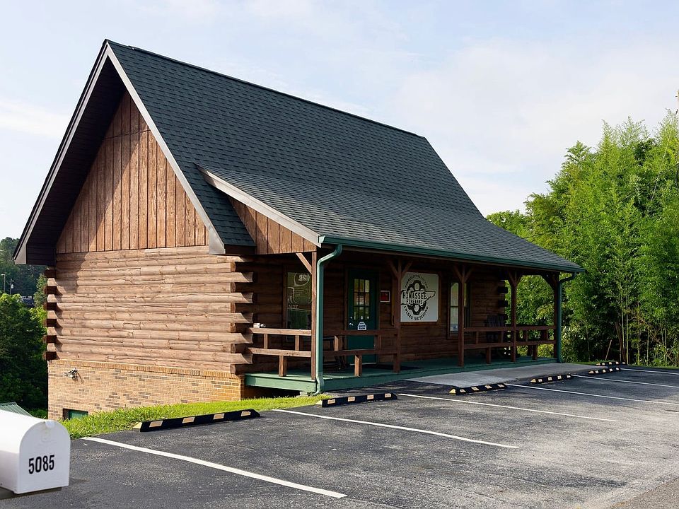 As you approach the property, you are greeted by the rustic charm of a lodge-style cabin, complete with a welcoming front porch, enhancing its warm appeal. Inside, the main level boasts a spacious open showroom, one private office room, a fully equipped kitchen, and a convenient full bathroom. The upper level features an additional office space that overlooks the showroom below.