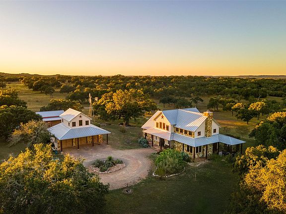 Tranquil 25 acre Wildlife Exempt Ranchette, located just 3 miles outside of Blanco encompassing a luminous 2800+/- sf 2 bed, 2.5 bath Hill Country Craftsman Home accompanied by a spacious carriage house featuring a 2.5 bay garage with a convenient 1 bed 1 bath casita above and a separate 40 x 45 metal workshop surrounded by alluring heritage oaks and striking Hill Country Views. The moment you step foot on the property, the exceptional quality in craftsmanship and rustic charm will make you feel right at home. Thoughtfully constructed to take in scenic Hill Country vistas from every window, the vaulted tresses of the living room coupled with a Texas sized stone fireplace bring warmth and expansive breadth to the residence providing the perfect setting to enjoy daily serenity or host a grand gathering. The chef's kitchen showcases custom cabinetry and flows to an indoor dining area framed by a stunning accent wall with a French door leading out to al fresco dining just on the opposite side of the masonry wall. The generous primary suite offers multiple design configurations with large walk-in closet and its own enchanting back porch. Venture up the beautiful floating cedar staircase to lofted guest suite featuring office space, expansive bedroom, and ensuite bath. Grill out on the wraparound porch while enjoying picturesque sunsets, prevailing breezes and admiring the native wildlife. The carriage house is host to plenty of storage on the first floor and a darling guest suite upstairs complete with full bath and sitting area. Beyond the carriage house lies an 1800 sf concrete floored barn/workshop perfect for the tractor and beaconing for projects. Fully fenced and currently wildlife exempt with inviting purple martin birdhouses. Ideal land and topography for livestock and animals to graze. Less than 10 minutes from restaurants and shopping in historic downtown Blanco and the Blanco River. Located 1 hour from Austin and San Antonio. No HOA.