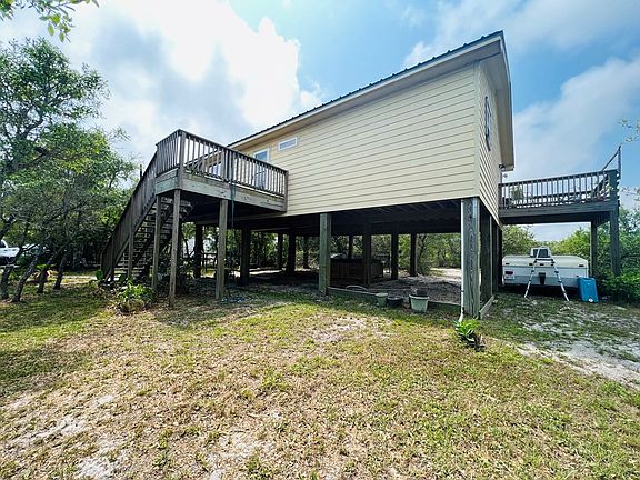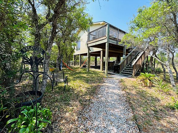 Welcome to Coastal Country outside city limits. Stilt home nestled away w/ peace & quiet amongst beautiful oak trees on 5 beautiful acres. 180" Deep well & conventional septic system will support 4 bedr. Lots of possibilities to build a first floor, add more living space to fit your needs. 1200 sf Warehouse 5yrs old, w/ electricity, big enough to store all your toys &/or serve workshop to build more toys. Currently has 14' wide 11' high swing door w/ 2 potential swing doors built, just need to be cut on one side to be fully operational. A 40' shipping container serves as main wall of warehouse w/ 320' additional storage & outside access. Hot tub negotiable w/ new heater & pump, not wired, & never used. All appliances convey. Gas stove fueled w/ 90 gallon propane tank. Vinyl plank flooring in living & kitchen areas. Kitchen counters granite and walnut butcher block. Bedroom w/carpet & both full baths sovereign stone floors. Open decks are great to enjoy view, relax, & take it all in.