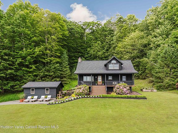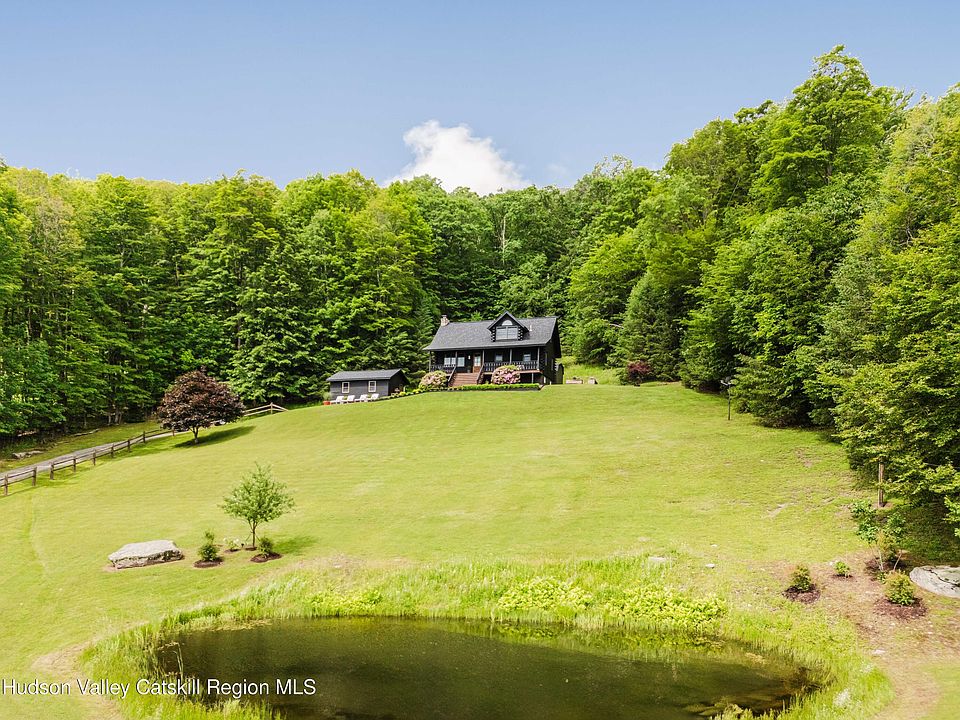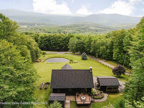 Welcome to Upper House Chalet, a designer log home with Catskill Mountain views, a private pond, and tasteful modern upgrades. Tucked behind iron gates at the end of a long, wooded drive, this striking, black-stained log home sits on nearly seven private acres in the northern Catskills. Framed by postcard views of the mountains and complete with its own spring-fed pond, the property combines rustic architecture with designer touches, and is just a short drive to Windham and Hunter Mountains, trailheads, and charming nearby towns.The home is also available with a fully furnished option, offering a seamless, move-in-ready option.