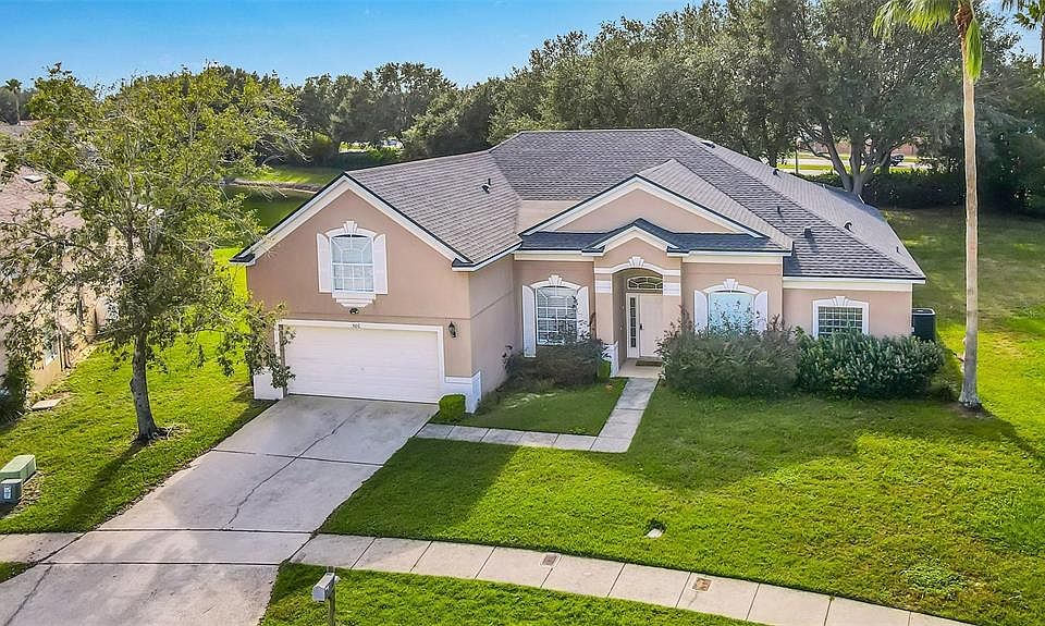 Welcome to this stunning two-story home, complete with your own private, screened-in pool, boasting beautiful pond views! The front entrance leads you to your dining room with windows bringing in light from your backyard and views to your lanai. The kitchen features stainless steel appliances, ceramic tile, granite countertops with a peninsula and island, along with a breakfast nook area opening to the spacious living room featuring laminate flooring and views to the backyard. This home offers two primary bedroom suites, the one downstairs with sliding glass doors leading to your oversized lanai. As you step outside, you will enjoy the screened-in pool area with an extended sunbathing deck to relax while taking in the views. Complete with 6 bedrooms, 4 bathrooms, and a 2-car garage doubling as a game room, this home also enjoys community features such as a swimming pool, communal cabana, two fenced play areas, tennis courts and a sand volleyball court. Enjoy easy access to Disney and all of Central Florida's attractions and major highways. Brand new in 2022: Kitchen Counters, A/C, Water Heater, Roof, and Pool Heater!