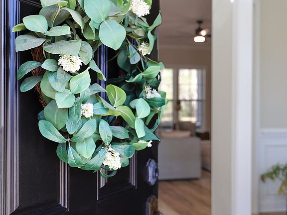 Upon entry, guests are greeted by the grandeur of the foyer, leading to the main living area adorned with upgraded commercial grade LVP flooring. The living room features tasteful trey ceilings and custom-built cabinets, creating an inviting atmosphere for relaxation and entertainment. Large windows throughout the home flood the space with natural light, accentuating the modern design and architectural details and updated pendants.
