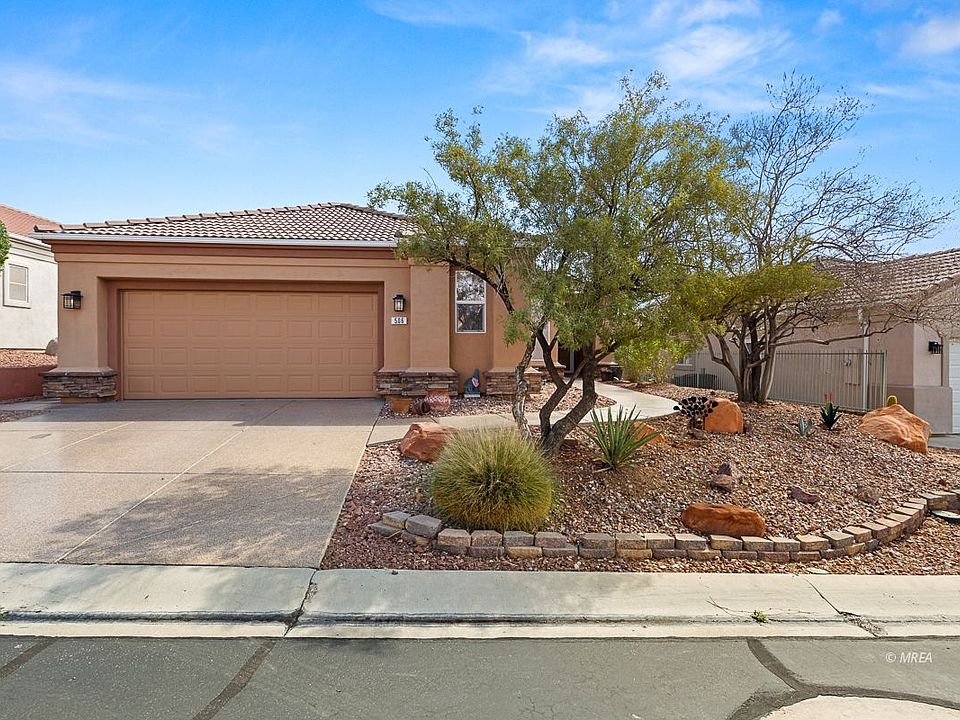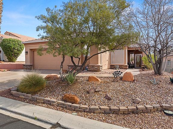 This beautiful home is located in a gated, golf course community north of I-15. Highland Fairways is an Active Adult Community offering low maintenance living and a convenient location in the center of town. From the cascading entry waterfall/rock feature to the lush landscaping throughout this well manicured community, you will not be disappointed. This home is situated on a spacious home site offering mountain views and an eastern orientation, ideal for year round use of the large covered patio. The yard is fully fenced and the landscaping is mature offering an array of color. The floor plan is open and the ceilings are vaulted. Windows line the home providing natural light. A wood like floor accents the great room and the electric fireplace adds ambiance. The kitchen has attractive Corian counter tops, stainless appliances, plank tile flooring and the center island allows additional room for food preparation. The master suite is roomy and has a sliding glass door out to the private patio. The laundry room is awesome with ample cabinets and a desk/work station. The HOA fees are minimal and include access to the Mesquite Vistas recreational facility, swimming pool and hot tub.