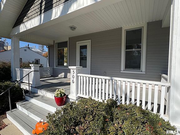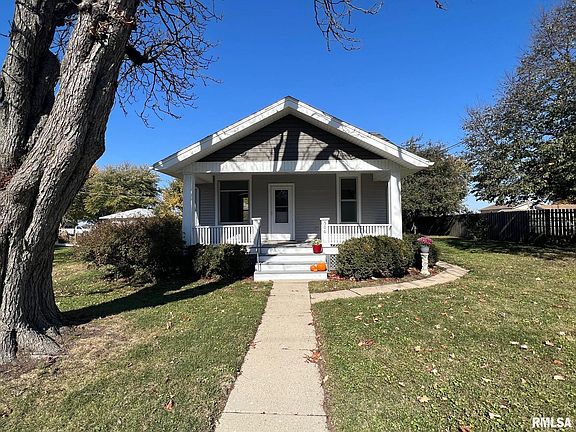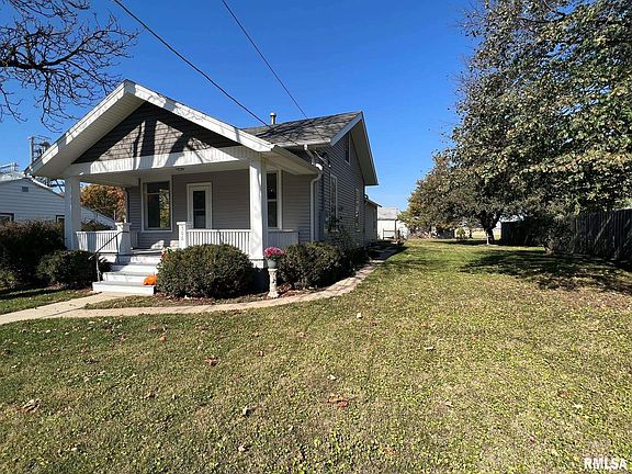 Darling two bedroom vinyl sided Emden, Illinois bungalow style home situated on a roomy 85X140 lot! The turn key interior features an open living/dining concept with gleaming refinished hardwood flooring and trendy newly installed fixtures, a roomy eat-in kitchen with newer countertops, luxury vinyl flooring, classic built-in feature, as well as a large adjacent walk-in pantry, two efficient bedrooms -- both with hardwood flooring -- front bedroom is host to a pocket door entry point, tasteful full hall updated bath, and a roomy rear laundry/mudroom area. Property also features a great walk-up floored attic, usable basement, fabulous covered front porch, quaint rear deck, older detached garage as well as shed structure, and SO many recent updates including fresh paint throughout, fixtures, bath remodel, countertops, flooring, exterior vinyl siding and gutters -- the list goes on! City water/private septic system on premises. A true small town dollhouse -- MUST TO VIEW!