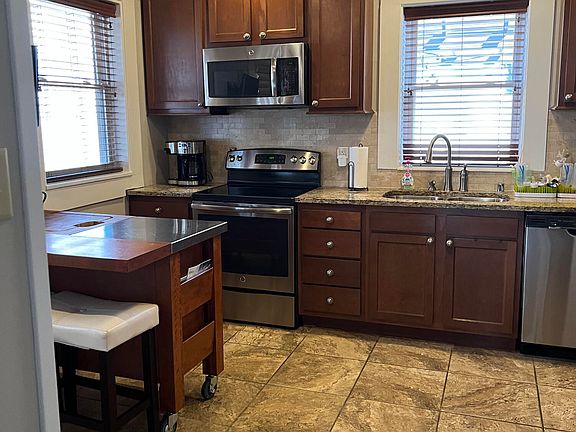 • Features: Walk-Out Access, Window Treatments, Laminate Flooring, Kitchen Island, Eat-in Kitchen, Wood Cabinets, Hardwood Floors