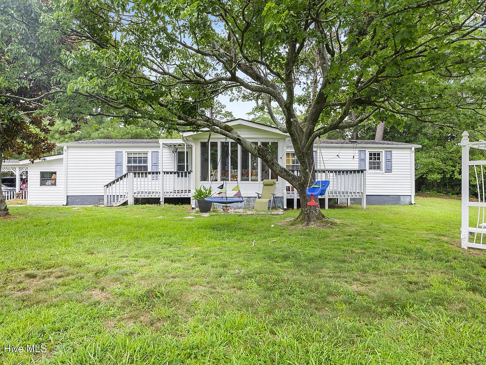***5K in USE AS YOU CHOOSE CREDIT AT CLOSING*** Welcome to this charming 3-bedroom, 2-bathroom home in the Topsail Greens community! Boasting over 1,500 square feet of living space, this property offers an ideal floor plan in a serene setting. Enjoy peaceful mornings or relaxing evenings in the enclosed sunroom or on the back deck overlooking your quiet, pond-front yard. Step inside and be greeted by a spacious living room. Just off the living room is a dedicated dining area featuring built-in cabinetry for added functionality. The kitchen is a true standout with bold blue cabinetry, sleek gold finishes, butcher block countertops, and stainless steel appliances. The split floor plan ensures privacy, with the primary suite on one side of the home. The primary bedroom offers double closets and a stunning ensuite bathroom with an emerald green tile walk-in shower, upgraded vanity, and tasteful hardware throughout. Two additional bedrooms on the opposite side of the home each offer walk-in closets and share a full updated bathroom providing ample space for family or guests. Additional features include a one-car carport and a storage room for all your extras. Located in the coveted Topsail School District, this home is just a short drive to the beautiful shores of Topsail Beach.