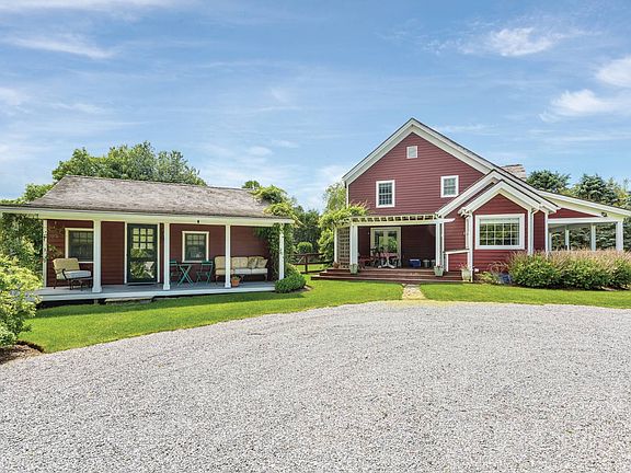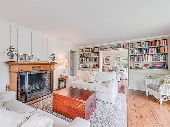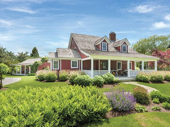 Perfectly located in Water Mill's horse country, this newly listed and utterly charming two-story country farmhouse is situated on an acre of lush and beautifully landscaped grounds, which include a separate cottage with full bath and kitchenette. Beds of hydrangeas welcome you to the front porch, where there's ample room for seating and dining. The home's rustic yet sophisticated interiors have a vintage look and feeling while providing the amenities for today's living. A bright living room overlooking the rear grounds features a wood-burning fireplace and built-in bookshelves. In the hall is a wet bar concealed behind double doors. A formal dining room has French doors to a front patio covered in wisteria - an ideal spot for breakfast or morning coffee. In the kitchen, which is great for entertaining, are marble-topped counters and island, a breakfast nook, white beadboard walls and stainless steel appliances by GE Monogram including a six-burner range, double oven, an additional Advantium oven and two dishwashers. A den with fireplace and walls of natural wood could become an additional bedroom. The four bedrooms and three and a half baths include an upstairs master suite with a walk-in closet and bath with double marble-top vanity, soaking tub and tiled shower with overhead and handheld sprays. Two additional bedrooms share a bath, and one of them overlooks the pool area. Outdoors in the private yard is a garden shed and vegetable garden. Statuesque mature trees include weeping willows and tall spruces, and there are beds and borders of flowering perennials and roses. An expansive rear patio has plenty of space for relaxing while overlooking the garden, and has an adjacent covered dining area. Enjoy the heated gunite pool and pool house, watch the clouds float by and listen to the songs of birds. When you're ready for fun, you're in easy reach of ocean beaches, Bridgehampton's wine country, restaurants and farm stands.
