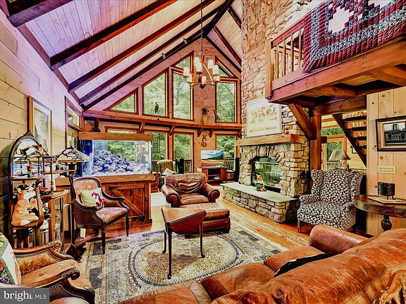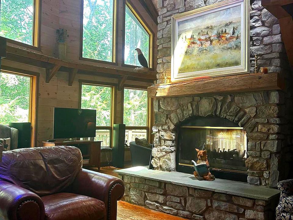 OPEN HOUSE SATURDAY SEPTEMBER 13, 11-2 pm. Welcome to Spring Hill Acres a Private A-Frame Retreat on Over 8 Wooded Acres. Plenty of possibilities with this home. Own as a second home and can be used as a short/long term rental. Tucked away in the heart of Spring Hill Acres, this stunning A-Frame log cabin-style home offers unmatched privacy, charm, and space on over 8 acres of mature woodland and beautifully landscaped land. Featuring 4 bedrooms, 3 full baths and a flexible floor plan, this home is ideal for those seeking both comfort and connection to nature. Enjoy first-floor living with an open-concept design showcasing a gourmet kitchen, large dining area, and a stunning double-sided stone fireplace in the living room. French doors open to a wraparound porch, perfect for entertaining or quiet mornings in the fresh air. The owner's suite includes private deck access, a walk-in closet, and a spa-like bath with roll-in shower and double vanity. Upstairs features a loft, three large bedrooms, and a full bath with skylight. A separate stairway from the bonus room over the garage offers additional privacy--great for guests or multigenerational living. The finished lower level boasts a family room with wood-burning stove, walk-out access, a wet bar, and a wine cellar. Enjoy a 4-season sunroom for a year-round birdwatching, a 3-car garage, and thoughtful upgrades like a geothermal HVAC system, automatic generator, and security driveway sensors. Outside, explore landscaped gardens, a fenced 2-acre pet area, a rose garden, and a tranquil fishpond with a waterfall and stone path. The newly paved driveway includes sensor lighting and mid-way parking pad. This peaceful, well-appointed home blends rustic elegance with modern convenience. Don't miss your chance to tour this private paradise!