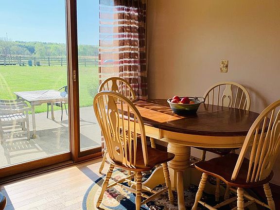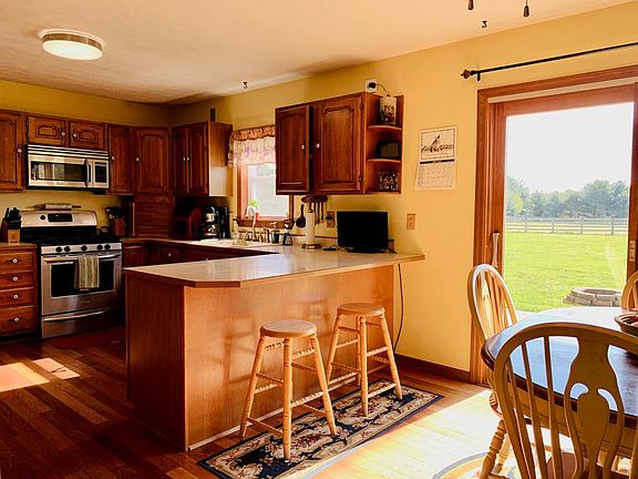 Beautiful scenic property, perfect for the horse enthusiast! This well maintained 3 bed 2 bath ranch home has hardwood floors, gas fireplace & stove and a partially finished basement offering a 2nd living room and bonus bedroom/office space. In the attached 2 car garage a custom barn-wood sided mudroom has been built and tied into the homes heating & cooling system for year round use. Adjacent to the home is a 30 x 40 pole building complete with 11 ft tall garage door, built-in work bench, 100 amp sub-panel and 30 amp RV plug in. A tack room adjoins the pole building and livestock barn, where you will find 4 separate stalls and water tap (rubber floor mats in stalls and aisle-way stay). 3 1/2 acres of this 5+ acre parcel are fenced in, including a 1 acre 3 strand electric rope pasture at the front of the property and a 4 board high wood fence pasture with paddock located directly behind the house. Enjoy quiet evenings on the back patio overlooking views of this beautiful farm!