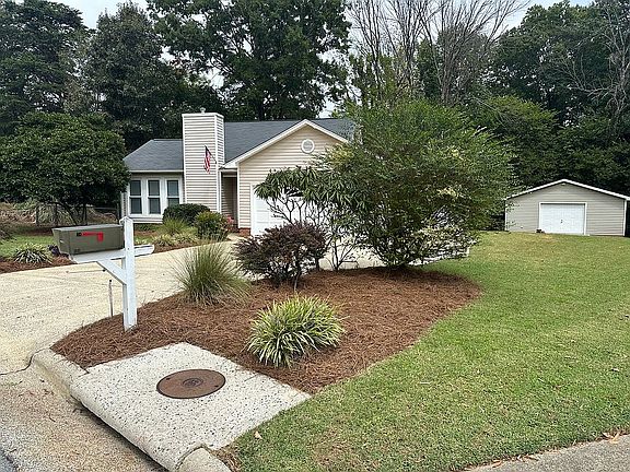 OPEN HOUSE 9/27 & 9/28 10a-3p. BUYER’S AGENTS WELCOME! 3 bed 2 bath charming home sits at the end of a quiet cul-de-sac on a large lot with great neighbors. Safe area for walking, bicycling and children at play. Convenient to schools, shopping and main highways. Enter into the family room with vaulted ceilings, tons of natural light, gas log fireplace and an open design to the dining area which leads to a galley kitchen. Ceiling fans throughout. Large master bedroom with 2 closets and en-suite bath. 2 additional bedrooms and a hall bath. Sliding glass back doors lead from the dining area to a large wrap around deck with lots of shade, trees and privacy in the back. Gutter guards on all gutters. Partially fenced back yard great for pets or children. All appliances remain - stove, microwave, refrigerator, dishwasher, garage refrigerator, washer and dryer. New HVAC system in 2025. New hot water heater in 2022. Laminate and linoleum tile flooring. No carpet! Storage building remains. Attached 2 car garage as well as large 24x24 detached 2 car garage with electricity, heating & a/c. Great space for a man cave, she shed, business, storage, family get togethers, race days, Super Bowl parties, etc.