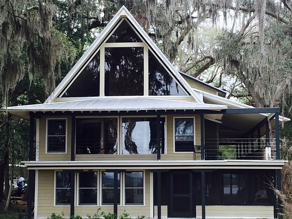 Fantastic salt waterfront home in gated community. Only 25 minutes from JAX airport door to door. NOT IN FLOOD ZONE! HIGH BLUFF, RIVER IS 26 FEET DEEP AT LOW TIDE. NO BRIDGES TO ATLANTIC. Private dock and floating dock, community boat ramp. The views are never ending, home faces west for evening sunsets. First level of home has one bedroom, screened porch, office (could be another bedroom), entertainment room (TV media with pool table), kitchen, laundry room with bath. Perfect mother-in-law suite or teenager lair. Second level has two bedrooms, one full bath, kitchen, dining room, and two living rooms around soaring fireplace. Wrap around decks. Third level has loft, private deck, master with full bath. Land has one acre with amazing live oaks everywhere, tree house and fountain. Three car garage. Older home with lots of charm. Warm and inviting, perfect for the entire family. Enjoy saltwater fishing, boating and lots of private sandbars.