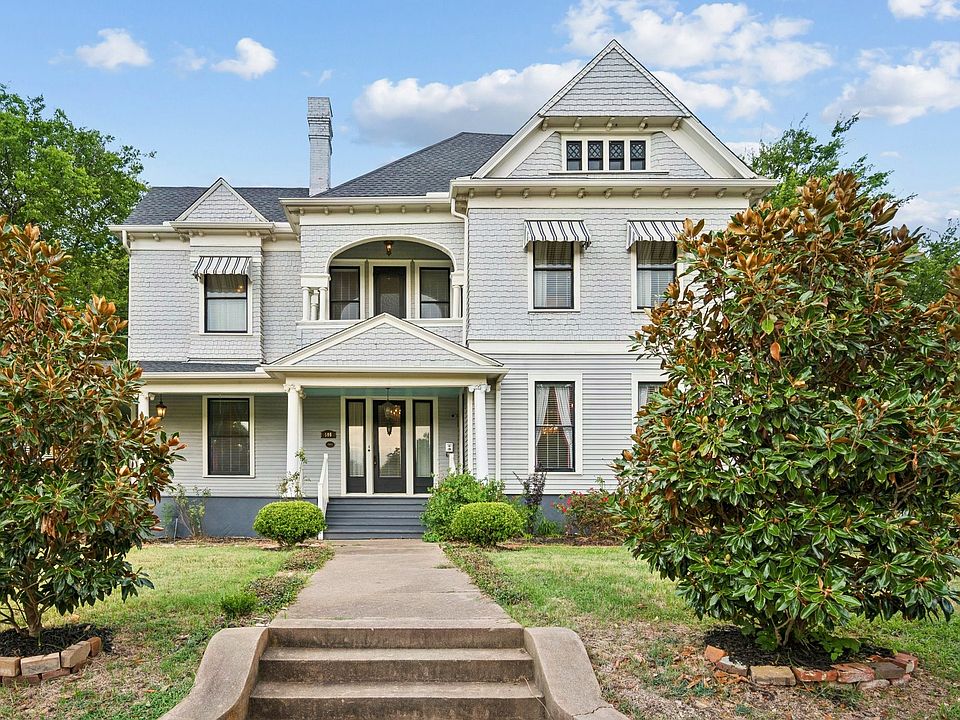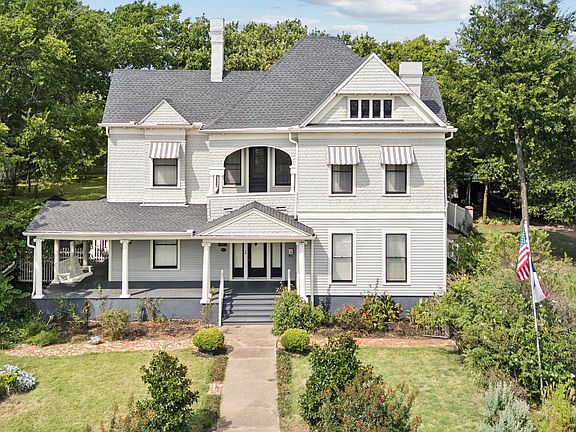 Welcome to The Vernon Brown Home, where timeless character meets everyday comfort. This historic residence rests beneath a canopy of pecan and oak trees, with wraparound porches and wide lawns that make it easy to imagine lingering outside on a quiet evening. Inside, the home tells its story through craftsmanship both subtle and bold. Fireplaces anchor nearly every room, hardwood floors display intricate inlaid patterns, and tall windows and stained glass invite the light to dance across the interiors. Wood cabinetry and built-ins add both warmth and function, reminders of the attention to detail that shaped every corner of the house. The layout flows easily from the dining and living rooms to a generous eat-in kitchen, giving plenty of room for gatherings without losing its inviting feel. Upstairs, balconies open off the bedrooms, adding unexpected spots to take in views of the grounds. Bathrooms combine vintage charm and modern updates, with a clawfoot tub alongside a walk-in shower. Outdoors, the property spans several combined lots, much of it irrigated, totaling nearly an acre, creating a rare sense of space in town. Mature shade trees, a gazebo, and broad stretches of lawn make the grounds every bit as memorable as the home itself. Just blocks from Sherman’s downtown, The Vernon Brown Home is a lasting piece of the city’s history, ready for its next chapter