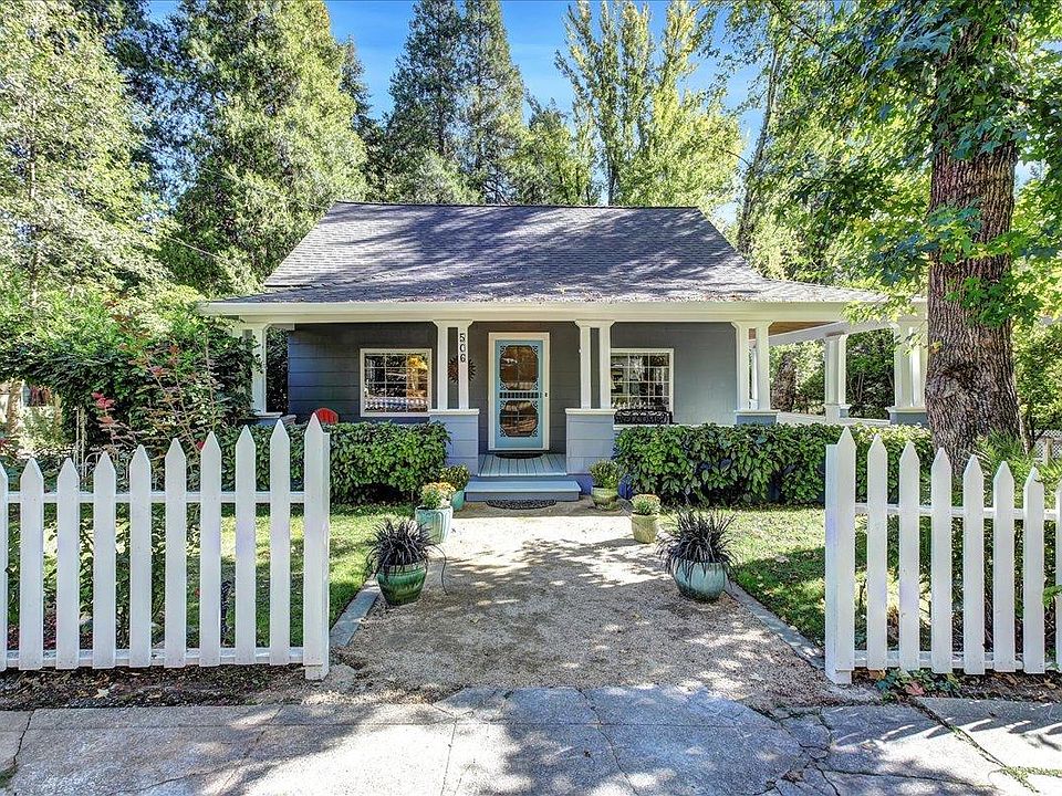 Picturesque & Updated pre-Victorian Cottage Style Home on one of Nevada City's most desirable streets. Walk to historic downtown in minutes on this tree-lined street with summer shade and a fall color feast for the eyes. Your greeted here by a proverbial wrap-around front porch overlooking the charming front yard. Enter the generously sized Living Room with hardwoods, natural light, crown moulding & NEW Double-Sided high BTU Fireplace. Sharing the fireplace is the stylish Family Room & skylight lit Dining Room w/porch access. An updated Kitchen w/ ample cabinetry, counters and modern appliance with new skylights. Wonderful Primary Suite is double-sized for the era with a sitting area or office space. New Bathroom has Marble Flooring, new toilet, & a new tub/shower w/subway tile. Guests will love the separated guest bedroom w/ covered patio view AND an all NEW BATH again with marble flooring. Outside the private Covered Patio is perfect for entertaining. A lovely backyard & additional patio too. PLUS an insulated & conditioned outbuilding ideal for Art Studio/Workshop or Office. The older garage and carport add character. This updated home has a New Roof, Gutters, Water Heater and Gas Generator. Attic has conversion potential. This home exudes style & character for modern living!