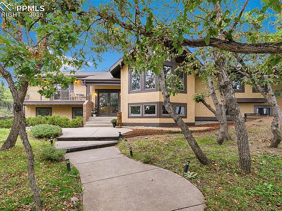 Situated on a quiet cul-de-sac in Upper Skyway, this one-of-a-kind custom home offers timeless character and a desirable location within the award winning School District 12. Step inside a spacious open-concept layout with vaulted, beamed ceilings, elegant wrought iron railings, sophisticated light fixtures, & abundant natural light throughout. Designed for both everyday comfort & unforgettable entertaining, this residence features multiple indoor & outdoor gathering spaces. The gourmet kitchen is a true centerpiece- combining warm rustic charm with timeless Italian design elements & featuring rich, hardwood floors, granite countertops, a large custom island, built-in shelves, & a beautiful stained glass window. Enjoy sunrises & city views from the East balcony off the kitchen. Walk out from the kitchen, formal dining room or luxurious primary suite to the expansive 900 sqft. patio. This breathtaking outdoor space is complete with a covered living area, built-in gas fireplace, lush yard & natural Colorado landscaping all around. There is plenty of room for everyone with 6 bedrooms (3 on the upper level & 3 on the lower level), which would also make great office, hobby or workout spaces. The primary suite offers private patio access, an attached spa bathroom with Italian marble floors, vanity with granite countertops, a soaking tub, walk-in shower & walk-in closet. You’ll find a cozy family room in the lower level with a wood burning fireplace, built-in wet bar including a wine cooler, mini fridge, + built-in spirits dispenser, as well as, a large laundry room, huge storage space with an extra refrigerator & plenty of storage cabinets. Additional highlights include; brand new carpet throughout, new roof & new gutters, new laundry room tile, & Anderson windows + doors. Just steps from Bear Creek hiking & biking trails & a short drive to Downtown, OCC & Manitou. This home provides a wonderful Colorado lifestyle- don’t miss the opportunity to make it yours!