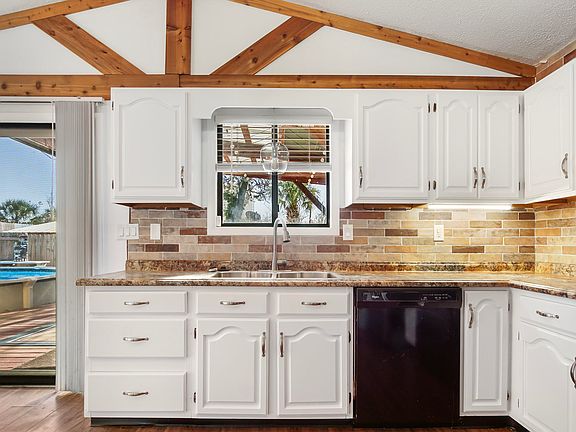 UPDATED! Charming & Cozy 2BR/2BA Home with pool, perfectly nestled in the well sought after community of Open Sands. Golf Cart Friendly Community, 2 Blocks to the Sugary White Sand Beaches & Emerald Coastline. Updates: 2024: New Roof W Solar Panels and fresh paint throughout the interior & cabinets, lighting & mirror in master bathroom. Recent Upgrades: Vinyl plank flooring, brick backsplash, entire master bathroom, ceiling fans, lighting, garbage disposal & sprinkler system. Open floor plan with vaulted ceiling and wood beams. Sliding glass doors open to your Backyard Oasis with a covered deck, fabulous pool & low maintenance landscaping, decorative lighting and a utility shed. Just over a mile to Pier Park Shopping, Restaurants & Entertainment.
