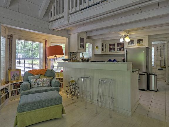 Adorable Cottage Style Cabin is nestled on gentle wooded tract...tucked away in quaint lakeside paved community, yet just minutes from historic downtown Blue Ridge...2 bedroom/2 bath home is newly remodeled & graced by surrounding mountains, spacious custom kitchen w/ stainless appliances, plentiful windows along with natural & painted wood interior keep it light, yet cozy, guest bedroom leads to open deck and level, low maintenance yard area, large "sleeping loft" master, wood floors, sky high ceilings in great room & dining areas, lovely log construction, claw foot tub & subway tile among flawless features, full unfinished basement for storage & future expansion....all a "stone's throw" from Lake Blue Ridge and beach area, great walking and biking, lush landscape with easy access, great full time home, vacation rental, or that much needed mountain getaway & move in ready with vintage feel...What a charmer!