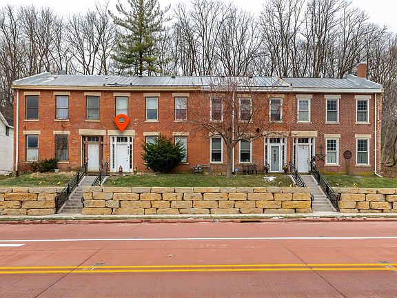 Beautifully updated 3 bed, 1.5 bath interior brick at Historic "Marsden's Row" perched in a convenient location just a few blocks from all the shopping, dining and festivities of vibrant Main Street, Galena. Welcoming foyer greats you as you enter the bright and airy main level that features generous living room with tall ceilings, large dining area with more sweeping ceilings and plenty of room to entertain, well-appointed under-stair powder room, and gorgeous kitchen with sleek white cabinetry, stainless appliances, tile backsplash, quartz counter, laundry nook with full size stacked washer and dryer, and access to concrete privacy patio with fenced surround and limestone planter. Retreat to the upper level to find a spacious primary bedroom, two comfortable guest bedrooms (one with tall ceilings and the other with rich, wood clad ceiling) and upgraded full bath with soaking tub/shower combo with subway tile surround, tile floors, LED framed mirror, and pedestal sink. Newer limestone retaining wall to front, cozy front yard, and stairs with newer railing that lead to sidewalk. Dual access shared driveway that wraps around entire row and offers parking to rear. Boiler recently replaced. A lovely piece of history that offers the feel of yesteryear mixed with the styling of today, all in a great location with easy access to everything Galena! *Assessor shows age as 1935, but property dates to well before 1900.