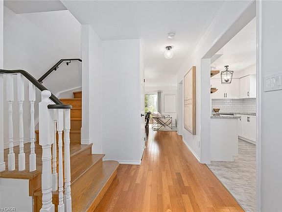 Bright, beautiful and bursting with charm! Discover this meticulously updated 3-bedroom, 3-bathroom townhome in Burlington's tranquil and picturesque Shoreacres neighborhood. An incredibly convenient location that puts everything within reach including a short stroll to Lake Ontario and the historic Paletta Lakefront Park, and minutes from downtown Burlington's vibrant shops, cafés, and restaurants. Enjoy nearby recreation at Nelson Park with its swimming pool, splash pad, sports fields, and scenic walking trails. If you are a walking enthusiast or enjoy a leisurely stroll, Centennial Trail offers a breathtaking 15.9km route, access within minutes from your new home. Inside, an abundance of natural light fills every room, highlighting the thoughtful updates throughout. Hardwood floors flow across the main and second levels, leading to a designer kitchen with custom backsplash, sleek cabinetry, granite countertops, stainless-steel appliances, and a sophisticated coffee bar. The open-concept living and dining areas feature elegant wall paneling for added character, contemporary light fixtures and a convenient walk-out to the patio, perfect for morning coffee or evening entertaining. The private fenced in yard backs directly onto lush green space, offering a truly serene retreat. Upstairs, the spacious primary suite offers a spa-inspired ensuite, aesthetically pleasing custom closets with brand new French doors while two additional well sized bedrooms and an updated main bath complete the second floor. The professionally finished basement provides flexible space for a family room, gym, or home office, with pot lights creating a bright, inviting atmosphere. Every corner and detail of this home has been carefully designed and cared for, making it truly move-in ready and an ideal place to live.