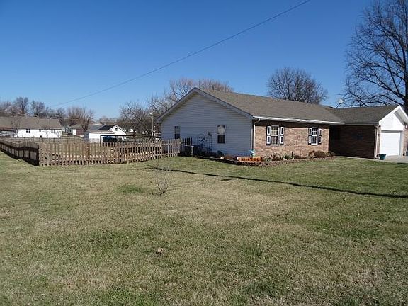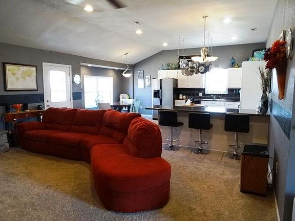 Lg. lot in the middle of town. 3 BR, 2 BA, jetted tub-double vanity- 2 closets in master BR. If you are a Dr. Seuss fan you will love the little boys BR. One of a kind walls. Laundry behind doors in the hall-shelves-hanging bar. LR, DR & Kitchen all open with recessed lights, vaulted ceiling, lg. island, stainless appliances, designated eating space, ceramic tile back splash & fl., hanging pot rack. 3 spaces divided by flooring. Wood burning fireplace has gas logs (only gas in the house). 7x7 covered front porch 21x21 Garage has hanging shelves, lower ones do not stay. Out back in the private oasis, wood fencing, plum-peach-apple-nectarine trees. 15x30 concrete patio, 11x20 concrete pad by the fire pit in the conversation area. Above ground pool with deck. Perfect place to entertain.