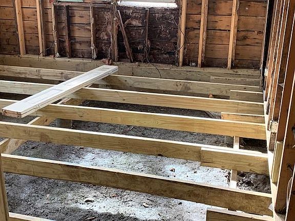 The majority of main level has been gutted down to the ground. Floor joists are replaced in one room; replacement windows for much of the house will be included with the sale. For this price, you can afford to put some sweat equity into it for a great return! $11,000.