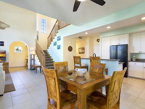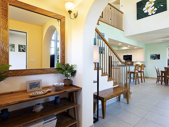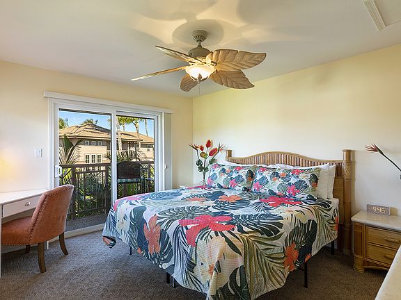 Waikoloa Colony Villas # 506 is an end unit with a bright and spacious floor plan, ideally located within the complex. The primary bedroom is located upstairs and a primary bath offering a soaking tub and double vanity sinks. There are peek-a-boo ocean views from upstairs lanai. The entry level living area boasts 18 foot ceilings and large windows that fill the room with natural light. This living room opens out to a patio sitting area with mature, tropical landscaping for privacy. The guest bedroom and an additional full bath are located on this level.