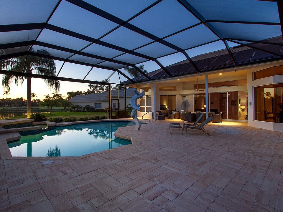 Possibly the finest panoramic view to be had from any home in the Vineyards! This gorgeous four bedroom plus den estate home and with 3.5 Baths, has been extensively upgraded to include marble stone floors throughout the living areas and wood floors in all bedroom, contemporary interior finish and decor complete with a spacious open floorplan. Large 8ft glass sliding doors highlighted with transom windows throughout living, family and breakfast areas allow continual sunlight to completely brighten the home. Magnificent southwest exposure with surrounding stunning long lake and golf course views encompass you while enjoying a fantastic oversized pool/spa, lanai and screen enclosure. Recent renovations to the home include New Roof, New screen enclosure and paved lanai, the pool itself has been refinished and is heated with both electric and solar panels. A special 2500 bottle climate controlled walk in wine cellar caps off this marvelous one of a kind, irreplaceable must see home in most desirous Wedgewood neighborhood at the Vineyards.