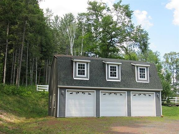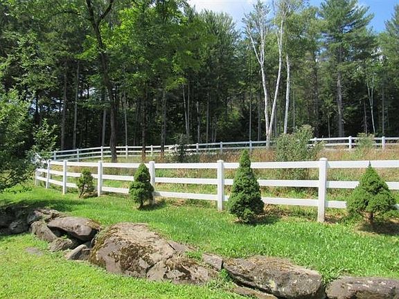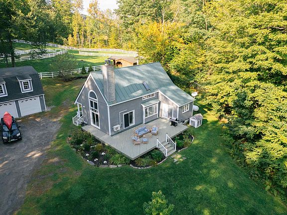 A great opportunity to acquire a small Woodstock horse farm nestled on 5+ private acres, with an updated 3 bedroom home, oversize detached 3 car garage with large storage room above or to be converted to offices/playroom,. This property also includes an Amish horse barn containing three 12x12 stalls, tack room, power and water, equipment shed, 2 fenced paddocks and even a riding ring. On main level is a handsome kitchen, with stainless steel appliances and granite counters, dining area that overlooks a deck and perennial gardens, dramatic living room, with hardwood floors, vaulted ceiling, exposed beams, and dramatic windows. Completing the 1st floor are 2 bedrooms and a bath with Travertine tiled shower. The upper level features a primary bedroom, with ensuite tiled bath, and den/office area. Partially finished basement has 30x23 family/exercise room. A wood deck wraps around the front of the house providing views of a rolling lawn down to the exclusive swimming pond. Trail system near by for the outdoor enthusiasts. Rolling yard accents this quaint home located on one of Woodstocks premiere roads. Just 5 minutes to Historic Woodstock Green. Okemo and Killington Ski areas within 30 minutes. Fly Fishing, championship golf and shopping all nearby. This property is being offered furnished with some exclusions. Come take a look!