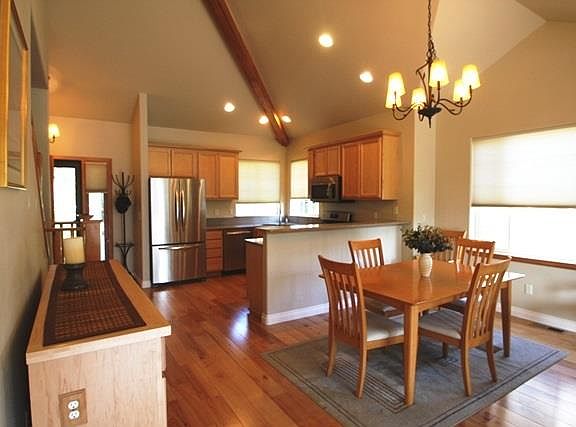 BEAUTIFUL WIDE PLANK HICKORY FLOORS WELCOME YOU IN THIS LARGE TOWN HOME AT THE RUNNING Y. THE KITCHEN FEATURES QUARTZ, MAINTENANCE FREE, COUNTER TOPS WITH STAINLESS UNDER MOUNT DOUBLE SINKS, 5 BURNER GAS RANGE, AND MATCHING STAINLESS KITCHEN AID APPLIANCES. THE DINING AREA IS ENHANCED WITH A CUSTOM SERVING/STORAGE BUFFET WHICH REMAINS WITH THE HOME. WOOD FLOORING AND QUARTZ COUNTER TOPS CONTINUE INTO THE MASTER SUITE. CUSTOM HUNTER DOUGLAS WINDOW TREATMENTS INSURE BOUNTIFUL LIGHT WITH PRIVACY. MUST SEE