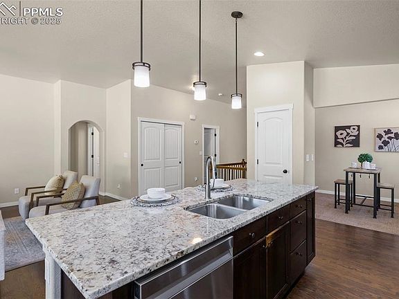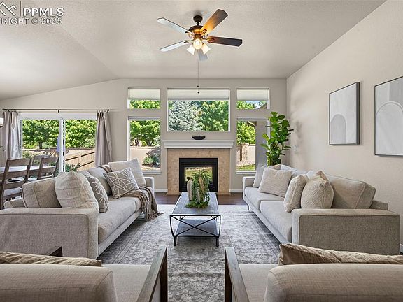 Welcome to this beautifully maintained 4-bedroom, 3-bathroom ranch-style home with over 3,300 sq ft of living space and a tandem 3-car garage, located in one of the most desirable neighborhoods in award-winning School District 20! Step inside to real wood flooring and an open-concept great room with soaring 10-foot ceilings, expansive windows that flood the space with natural light, and a stunning double-sided indoor/outdoor fireplace. The gourmet kitchen features granite countertops, stainless steel appliances, gas stove and flows seamlessly into the living and dining areas—perfect for entertaining or everyday living. Just off the kitchen, a versatile bonus space can serve as a study, playroom, office, or whatever suits your lifestyle. Retreat to the spacious primary suite, complete with a large walk-in closet, dual vanities, and a luxurious walk-in shower—your own private oasis. The spacious finished basement boasts 9-foot ceilings, additional living space, 2 bedrooms, full bathroom and a generous unfinished storage room for all your needs. Comfort features include central air conditioning and a truly move-in-ready interior. Fully fenced backyard & lovely Pikes Peak view from your back patio! Enjoy all the amenities of the vibrant Cordera community, including a clubhouse with an outdoor pool, fitness center, walking paths & bike trails, and regular social events. Happy Meadows Park, with its expansive open space and playground, is just a short walk away. Don't miss this opportunity to live in a thriving neighborhood featuring a top-tier middle and elementary school and unbeatable community features!