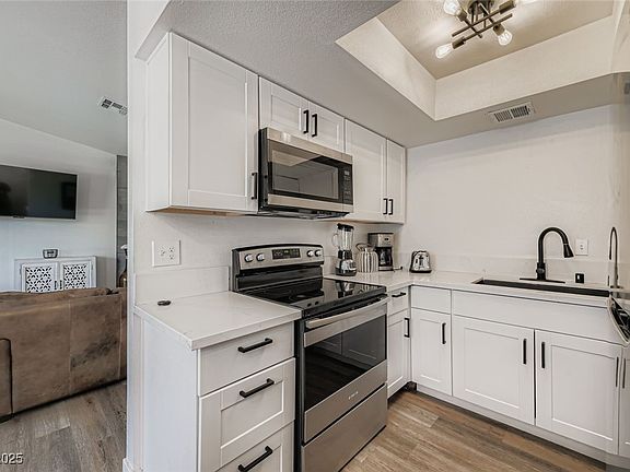 Top to bottom beautiful renovation! This immaculate condo is turn-key movie in ready—just bring your clothes! Desirable floor plan with two bedrooms, two full bathrooms, lovely furnishings, and a cozy fireplace. Enjoy a private balcony within a pristine community located right in the heart of Las Vegas. Beautiful kitchen with new white cabinets and quartz counter tops. Stainless steel appliances convey with the sale. Oversized bedrooms and beautiful flooring throughout. Don’t miss this amazing opportunity.