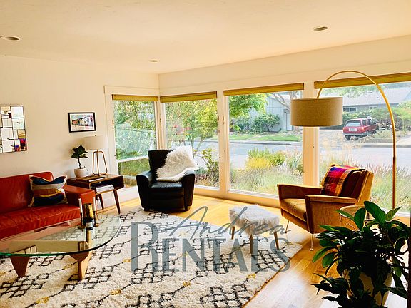 :: Given the current state of our county and world, AndreaRentals will offer virtual tours of empty properties by request. We are happy to chat by phone and answer questions, collect and approve applications and hold them as pending, and anything else we can do to keep things moving via technology. Our goal is to do right by our clients and by the public at large. Stay safe out there. :: Beloved home, never before rented, with an incredibly fun-filled yard - just waiting for you to come enjoy! This updated 4BR+/3BA modern ranch-style home on a wide level lot in the Oakland Hills is available now for 1 or 2-year rental. It's a truly special find, with tons of sun-filled living space, new upgrades, and hardwood floors throughout. AVAILABLE OCTOBER 15 FOR 1 or 2 YEAR LEASE. The green double front doors open to a wide foyer, with a large, bright living room on your right and dining room on your left. The living room has floor to ceiling windows that look out to the landscaped front yard, a wall of original built-in bookshelves. The dining room is spacious and conveniently accesses the kitchen, with views to the front yard. From the foyer or the dining room, you step into a large kitchen and open format den/media room, with an entire rear wall of windows and patio doors out to the back patio and lawn. The chef's kitchen is fully updated, with double ovens, a 5-burner gas stovetop, and plenty of cabinets and counter space. A convenient central island with bar stools separates the kitchen from the den, perfect for pouring cereal and coffee or entertaining guests while cooking a meal to share. The spacious and bright family room is large enough for an L-shaped couch and entertainment center, with extra space for hanging out and playing. The windows and patio doors open out to the backyard patio area, with a large outdoor couch, dining table, and raised planter beds. The outside patio furniture can stay or go! A long hallway off the right side of the den runs along the side of the house, with 1 bedroom in the front, a second bedroom and full bath in the middle, and a master suite in the rear. The front two bedrooms are bright and good sized, perfect for guest, or kids rooms. The hall bath is spacious and super clean, with double vanity and sinks and a large standing shower. At the back end of the hallway is a large master suite, with wide patio doors that open to the backyard seating area. The en suite master bath is newly updated and has a large standing shower, plus two large closets. On the opposite side of the den is a 2nd hall area, which is outfitted as a mud room for coats, shoes, and outdoor play clothes. There is another full bath off this hallway, with a shower over tub and single sink. At the end of the hall is a 4th bedroom, which would make a perfect home office - ideal for the pandemic work and school from home time we find ourselves in! The backyard is simply amazing. It's really three yards in one, with areas for relaxing and entertaining, gardening, and LOTS of space to run and play. Directly outside the den and master suite is a central patio, with grill, outdoor lounge furniture, and tables, all shaded by a triangular sun screen. Around the left side of the house is a large lawn area, perfect for working out or kicking a ball, with an overhead activity rope for playing and swinging. Around the right side is a raised veggie planter box already full of tomatoes, a peaceful hammock, and wow a large enclosed trampoline. Additional features that are sure to please, especially in these unusual times: -Central air conditioning! -Solar panels, which considerably reduce the energy bill -Built-in security system -Rent includes yard maintenance, and garbage service. -1 small dog considered with extra deposit The house is walking distance to Redwood Regional Park, and close to Joaquin Miller Park, Roberts Park and Anthony Chabot Park. Public Schools: Joaquin Miller Elementary/Montclair Elementary/Skyline HighSchool Private Schools: Head Royce/Bishop O' Dowd Available now. Showing by appointment only. Please call or email to set up a time and give us some information about you! Servane Valentin BRE#01999256 BRE #02003472 A Rental Concierge for Bay Area Owners and Renters Owner pays for gardener, and garbage
