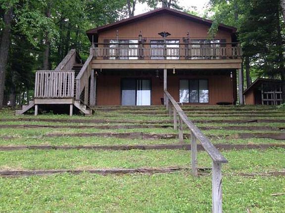 Island Lake waterfront! TRANQUILITY best describes this fabulous Four Seasons area for the nature enthusiast. Centally located to Gladwin & Houghton Lake and ATV/ORV Trail system. If your looking to get away at an affordable price, this is it. The Lake is surrounded by 230 acres of woods for your use to hike, hunt(deer & mushroom), ATV, ETC... owned by the corporation in which you as an owner are a share holder. Island Lake is PRIVATE & spring fed, with appx. 60 acres of crystal clear water & no off water homes. This home features a large waterfront, wrap around deck for watching the loons and bald eagles and a complete separate living area including full kitchen in the full, finished walk out lower level. And to top it off you'll enjoy tinkering in the workshop of this fantastic 3+ garage with plenty of room for all the toys. All of this and more located on a gorgeous deep wooded lot with a paved drive.