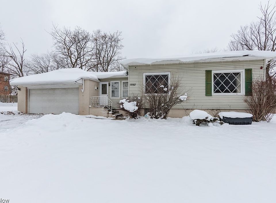 Welcome to this one-level ranch situated on an expansive lot of over one acre, offering exceptional versatility and easy access to I-480. The property features three bedrooms with oak hardwood floors, including brand-new carpeting installed in January 2026 in two bedrooms, while the third showcases hardwood as an option. The full bath includes a large jetted tub. The kitchen offers upgraded custom maple cabinetry, granite countertops, and a commercial-grade six-burner stove, with an open connection to the formal dining area—ideal for entertaining and everyday living. The lower level provides extensive storage and includes an updated half bath with the potential to add a shower, if desired. Additional highlights include a new roof installed in 2025, a home warranty for added peace of mind, and an oversized attached garage connected by a breezeway that could easily serve as a mudroom.