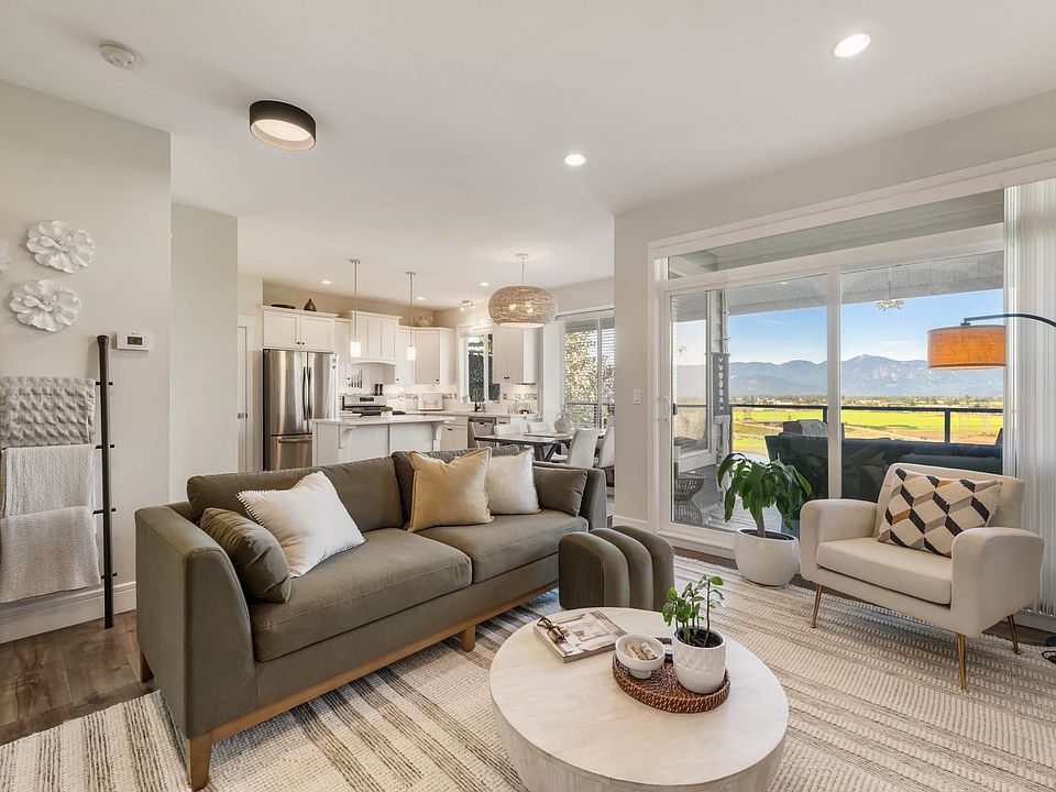 Welcome to The Cliffs-a boutique community perched above the valley with breathtaking 180° views of mountains, farmland, and the golf course. This 2,200 sq ft, 3 (potentially 4) bed, 4 bath stratified home features bright, open-concept living with floor-to-ceiling windows, a modern kitchen with quartz countertops, and a spacious balcony perfect for bbqs & sunsets. The primary suite offers a walk-in closet and spa-inspired ensuite, while the lower level includes a rec room/bedroom with patio access. Enjoy a double garage, ample storage, and low-maintenance living just minutes from The Falls Golf Course and hiking trails. Experience this incredible view and the warmth of this home in person. Book a showing any time.