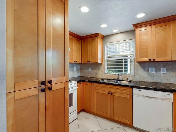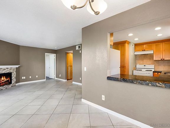 Welcome to your new home at The Villas! Move right in and enjoy this private, quiet retreat with fresh paint in neutral, on-trend colors, tile flooring, and high ceilings offering serene views of the greenery outside. The kitchen features beautiful wood cabinetry, granite countertops, and matching white appliances, with an open passthrough to the designated dining area. Relax in the large living room by the cozy fireplace or step out onto your private patio, perfect for morning coffee or entertaining. The generously sized primary bedroom boasts an updated ensuite with a gorgeous vanity, stone countertops, new fixtures, and a cedar-lined walk-in closet. The secondary bedroom offers outdoor access and shares a full hall bath with wood cabinetry and stone countertops. For added convenience, there's a stackable full-size washer and dryer in the hall closet. The unit also includes a 1 garage parking spot, an additional assigned space on the street, and a guest parking spot. Residents can take advantage of the nearby bike trail to Oceanside Harbor and enjoy access to the sparkling pool at neighboring Vista Monte. With dining, shops, and the freeway close by, don't wait—schedule your tour today!