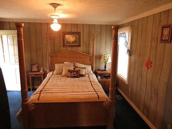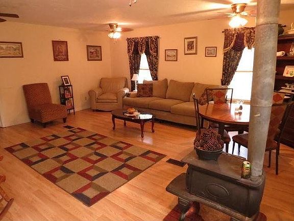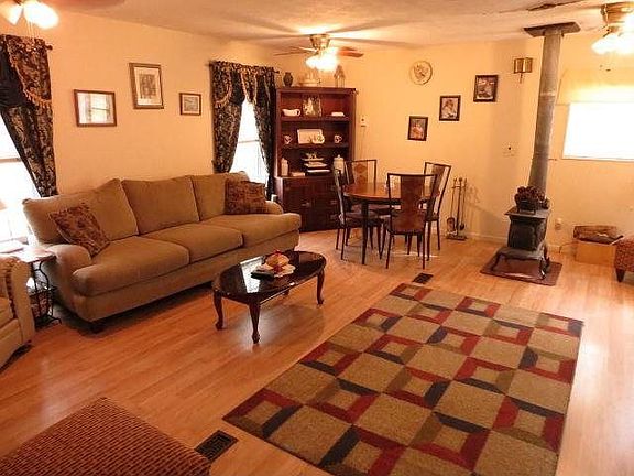 Charming home easy to maintain, low utilities, lots of land to expand and grow. Full acerage no HOA. Quite peaceful property with 2 sheds and front porch. Family room and dining area have new hardwood flooring and cozy wood burning stove. Can be used for both heat and cooking. Low utilities with family room fans for alternate air or heat distribution. All on one easy level. Fairly level lot with lots of space.