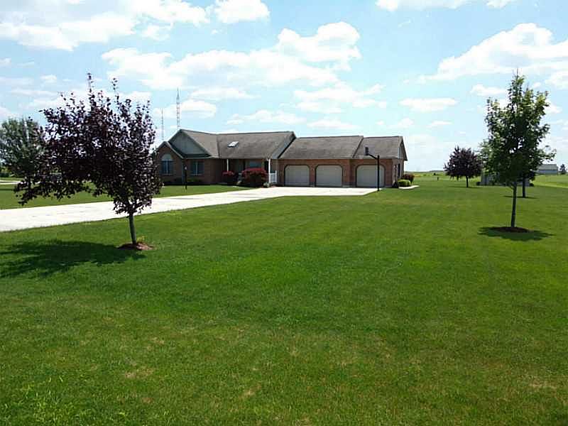 2071 SQ. FT. ON FIRST FLOOR & APPROX 1900 SQ. FT. FINISHED LIVING AREA IN BSMT. Custom built in 2001 all brick ranch hosting a 3 car heated garage w/floor drains, outbuilding, large covered front porch & covered patio off sunroom. Located on 2 acres, SELLER owns propane tank, well, septic. Inside you will find all oak trim, oak kitchen w/plenty of cabinets & counter space, 4 person eat-at bar. 3 full baths, 1 half bath, master bath w/shower stall & large whirlpool tub. Sunroom located off living room with sky lights, 2 walls of windows for natural lighting. Finished bsmt features a full kitchen w/more oak cabinets, pool table area, exercise room, bedroom & study (or use for extra storage). Family room features gas fireplace open to kitchen & pool table area (great entertaining space). YOU MUST TOUR TO SEE ALL THE EXTRAS!!