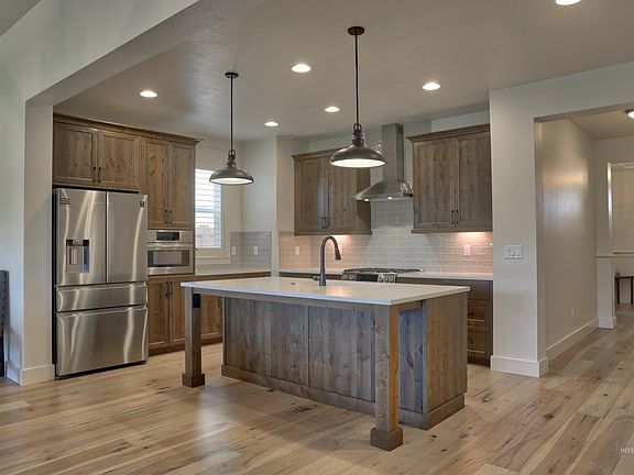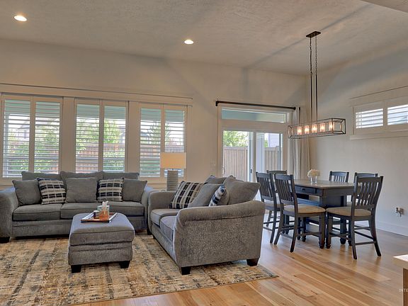 As you step inside, you'll be greeted by the warmth of engineered hardwood floors that flow throughout the spacious open-concept great room. The impressive stone fireplace serves as a stunning focal point, creating a cozy atmosphere for gatherings. The gourmet kitchen features sleek quartz countertops and Bosch stainless steel appliances, perfect for culinary masterpieces. The adjacent dining area flows seamlessly from the kitchen, making entertaining a breeze. Retreat to the expansive master suite, where you'll find a generous bedroom bathed in natural light & a luxurious ensuite bathroom with a zero-threshold walk-in tile shower. Laundry room access directly off the master closet provides an effortless flow for your daily routines. Step outside to the large covered back patio, perfect for outdoor living, while the low-maintenance synthetic lawn allows you to enjoy your yard without the hassle of upkeep. Additional features include wood shutters, a water softener, & an oversized two car garage.