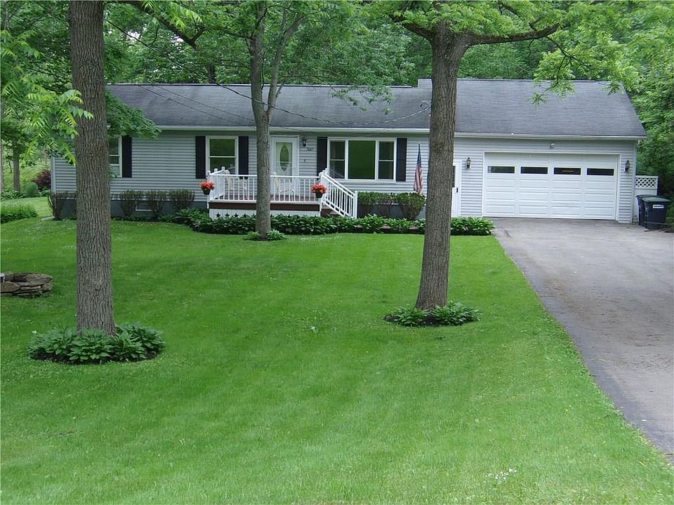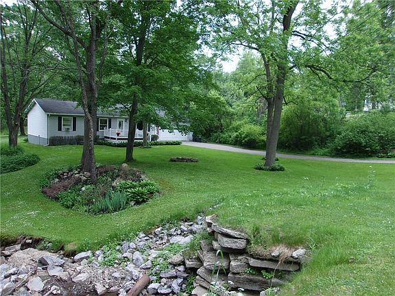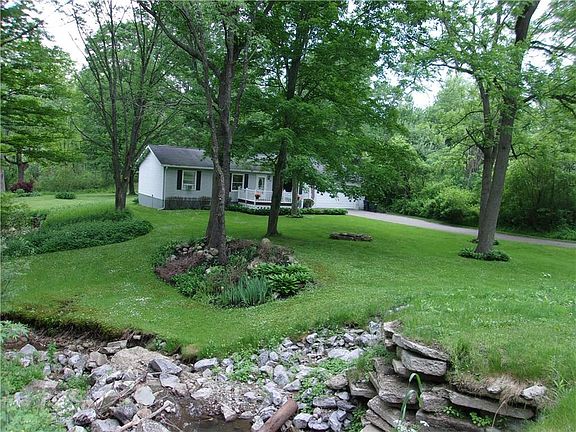 Bemus Point location, beautiful wooded lot w/stream features this well maintained ranch. 3br, possibly 4th, 2 baths, living room, dining room, open kitchen. Dining room has glass patio door to rear deck with a hot tub. Basement is finished with dry bar, laundry room, spare bedroom and 2 additional rooms for storage. Pole barn and tool shed on this 2.3 acre lot for tractor, boat etc storage. Home close to NYS bike and snowmobile trails.