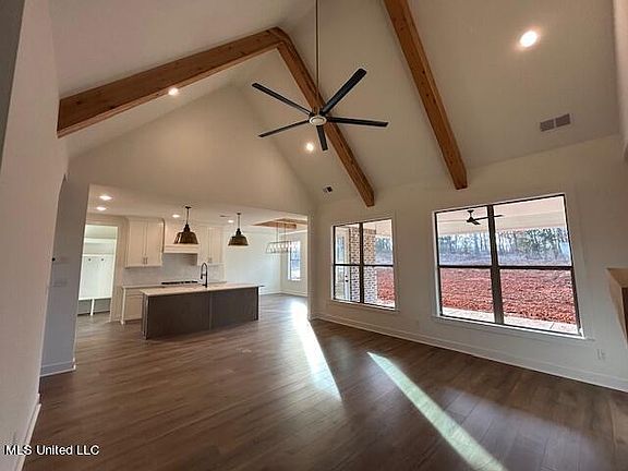 Beautiful 4 bedroom, 3 1/2 bath home with finished bonus room on 3/4 acre lot. Open concept with many extra design features. Entry has 42'' wood door with tall wainscoting on walls and trim built beams on ceiling. Great room has soaring cathedral ceilings with cedar beams, built in bookcases on each side fireplace with floating cedar shelves above them, and lots of natural light. Kitchen features quartz tops, custom ceiling height cabinets, tile back splash with herringbone design, double ovens, 5 burner gas cooktop, farm sink, and microwave drawer in island. Oversized breakfast area has tray ceiling with cedar beams. Half bath located off great room. Primary suite features trim built beams, 42'' barn door, double sinks on oversized vanity, free standing soaking tub, zero entry walk in shower with frameless glass enclosure, and walk in closet with custom shelving. Second down bedroom has en suite bath. Upstairs 2 generous size bedrooms, full bath, bonus room with closet that could be 5th bedroom, and both walk in and third floor attic space. Enjoy evenings at your covered back porch pre wired for TV. Tree lined back property line for extra privacy. Built to ridged energy efficiency standards. Conveniently located just minutes from I-269 and the main Lewisburg School campus. Offered by Classic Homes; one of DeSoto County's premiere custom builders. Schedule your showing today and be prepared to be impressed.
