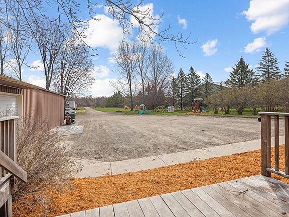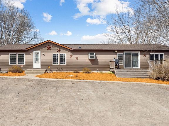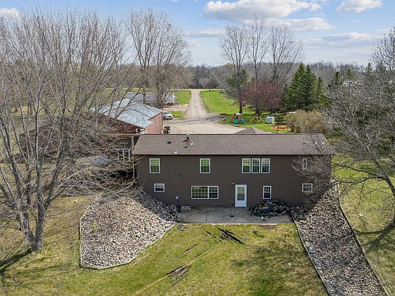 Great home on 4.8 acres, large yard with detached 2-car garage, pole shed 64.6x52 double door 10 feet high, sliding door side of garage 12x16 with concrete apron. Electrical & garage door opener. Home has many updates; kitchen, appliances, cabinets, flooring, 4-season porch off dining area. 3 bedrooms up. Primary has walk-in closet, bathroom with heated floor and whirlpool tub. Large living/family room with (electric) fireplace. Dining/living room vaulted ceilings. Lower level with 4-bedroom, family room area with w/o to patio (needs ceiling). Utilities/laundry room L-shaped. Also, storage shed 8x12 in back. A must see! Negotiable closing -prefer after June 1st. Plus 9,000 Lb hoist and 3 garage door entries, sliding door 119 x 15 workshop insulated with 6"of reinforced concrete. 40x163 main part of shed. Hoist and lawnmower negotiable.