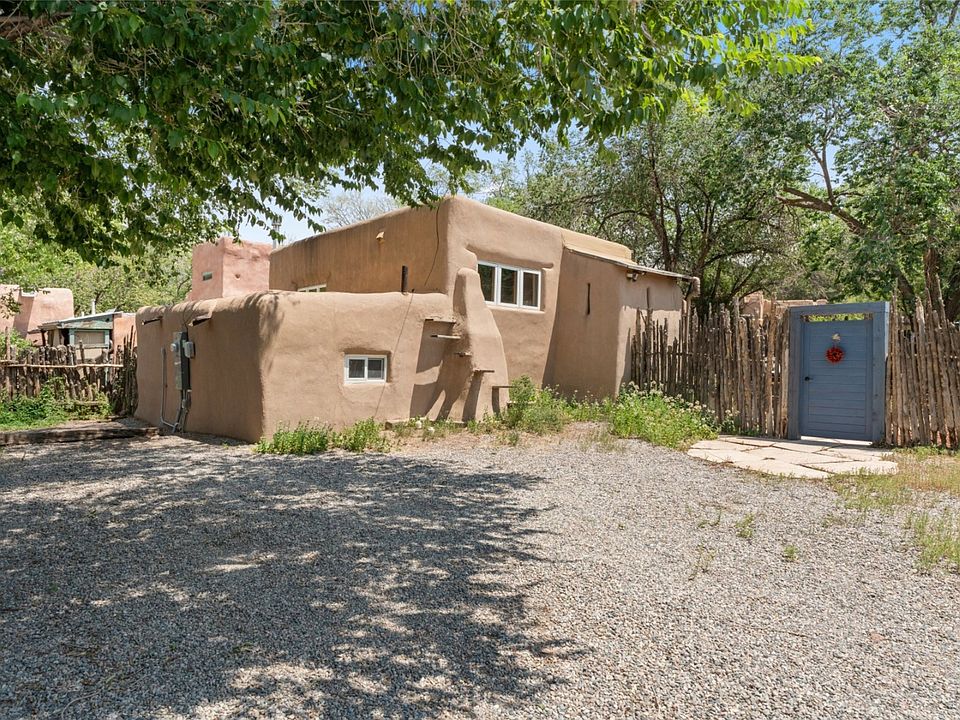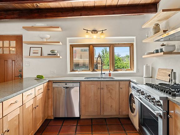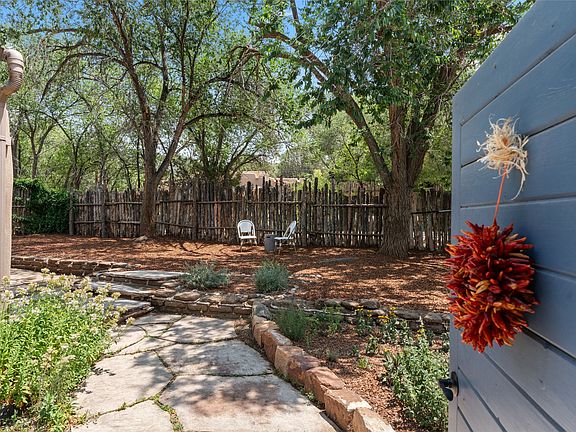 PERFECT ZEN SPOT ON HISTORIC EASTSIDE ENCIRCLED BY TALL GREEN TREES AND A COYOTE FENCE SPANNING THE SOUTHERN SIDE OF THE PROPERTY FOR PRIVACY. Ideal in-town hideaway: come in town to ski or enjoy a few weeks of festivals and culture! Discover the charm of Santa Fe with this enchanting adobe/masonry pied-a-terre, nestled on grounds of mature trees, wildflowers, and garden beds that serve as an "outdoor room" to extend your living space with indoor-outdoor appeal. Fabulous feeling "Tree House" with Kitchen and living room on the main level (up several stairs) and 2-bedroom, 1-bathroom downstairs. The updated kitchen features white oak shelves, abundant natural light, and modern appliances including an Italian gas range, Electrolux washer/dryer, and a Bosch dishwasher and refrigerator. The seamless blend of contemporary convenience, beautifully plastered walls, wood vigas & beams, and Saltillo tiling create an elegant cozy interior with classic Santa Fe style. Whether you're seeking a charming rental, a lock-and-leave getaway, or an intimate primary residence, this home is a little gem. Embrace the unique allure of the City Different. Situated in a neighborhood with far more expensive homes, many that have been newly built or renovated, this small property offers an ideal location at an unbeatable price.